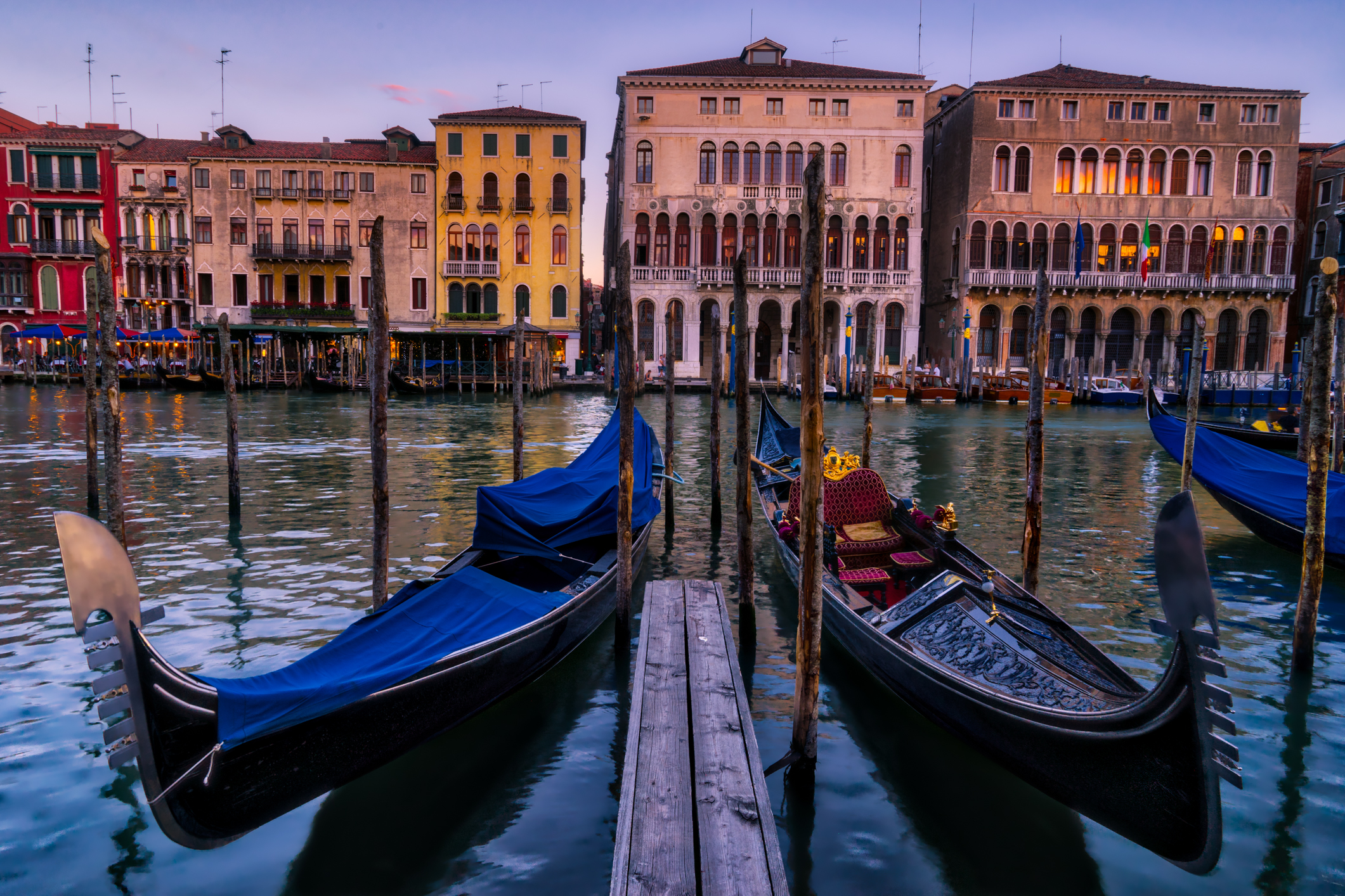 I was out looking for good views of the Rialto Bridge around sunset one day and came across these gondolas, tied up and waiting for their captains, I guess. I started out framing them from the side, with the Rialto Bridge in the background, but I didn't really like the composition too much, so I decided to just shoot them head on. Having the gorgeous buildings in the background looked good to me, so I fired away. The fading light of sunset didn't hurt either. Score!
