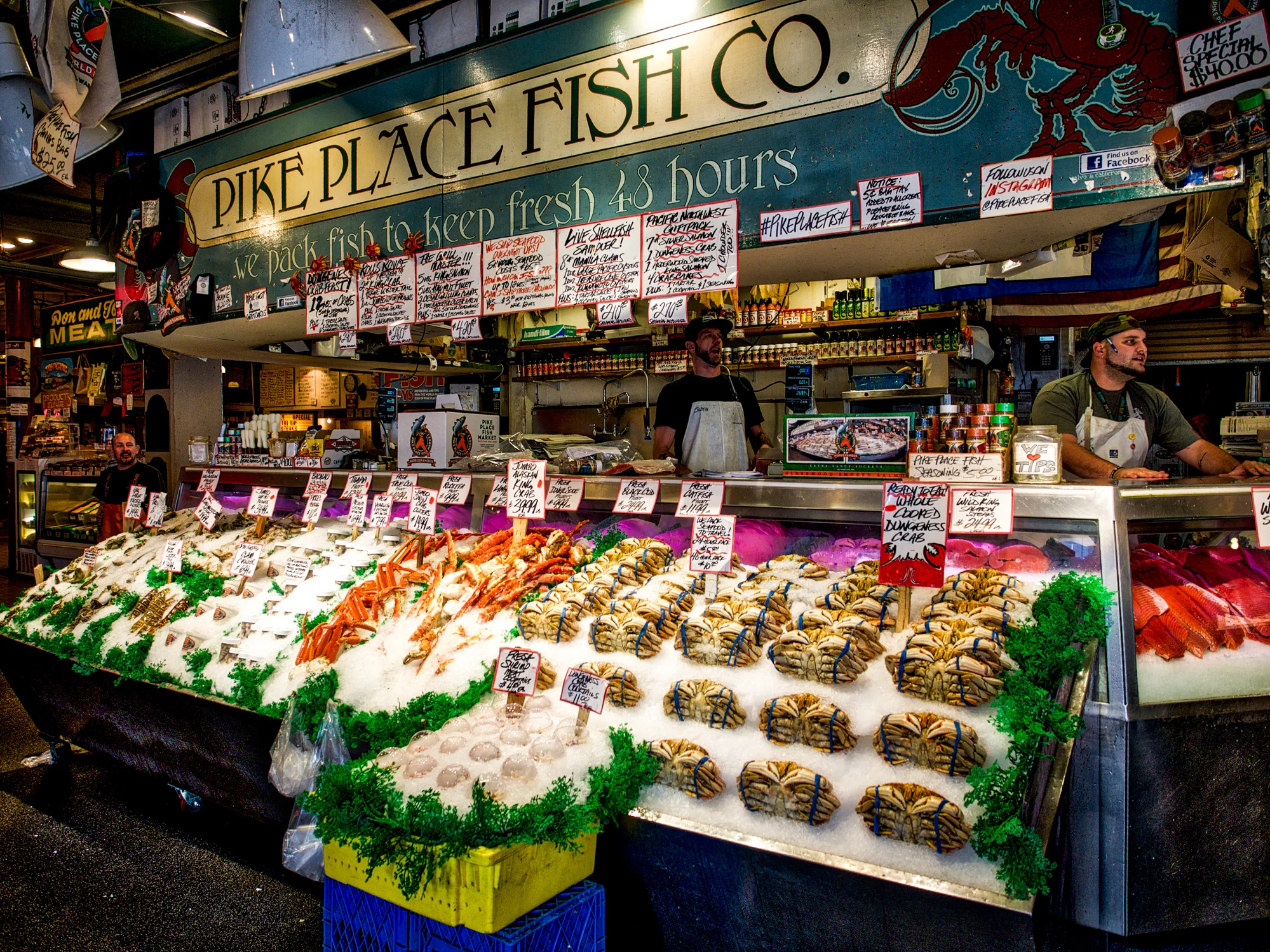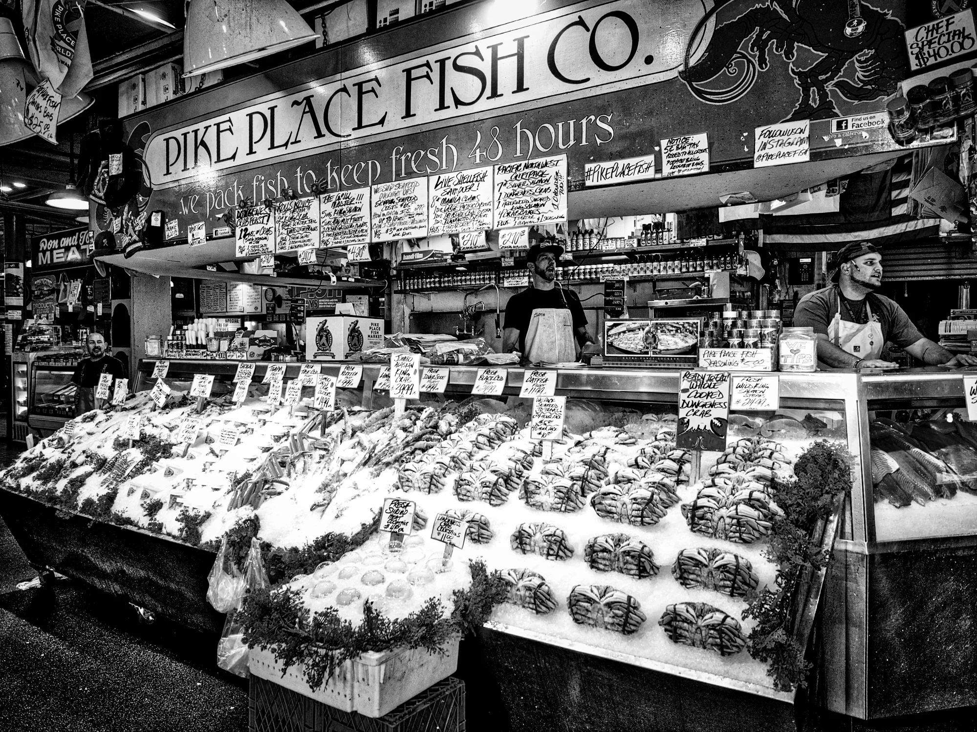We made a quick stop there last summer on our epic roadtrip, and I got out first thing that morning to shoot Pike Place (again). The first thing you see, assuming you come in the "main entrance", is this fish counter. It's famous for being the place where they are tossing the salmon around - it's quite fun.